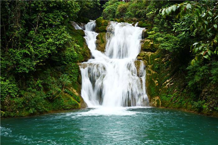 荔波小七孔,国家级5A级风景名胜区,位于贵州省黔南布依族苗族自治州荔波县城南部30余公里的群峰之中,景区全长7公里,集洞、林、湖、瀑、石、水多种景观于一体,山水秀美精巧,景区古朴幽静,置身景区之中,游人能欣赏到如诗如画的极致美景,如在仙境中一般。