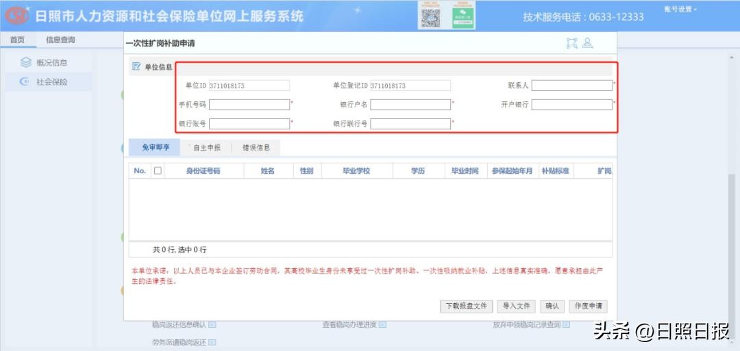 进入一次性扩岗补助申请页面,填写单位相关信息,点击确认。