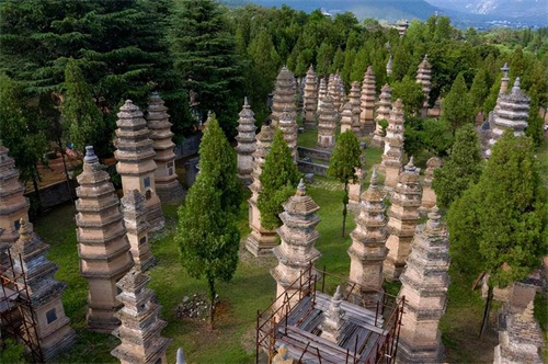 寺内参观完毕,走出山门朝西约300米是塔林。这里占地面积约2万平方米,有唐、宋、金、元、明、清及现代砖石墓塔231座,是历代少林高僧安息的墓地。塔的大小,样式因高僧的地位和去世的年代不同而各异。原还以为塔林都在山中部,这建在山脚下的塔林倒是意外。