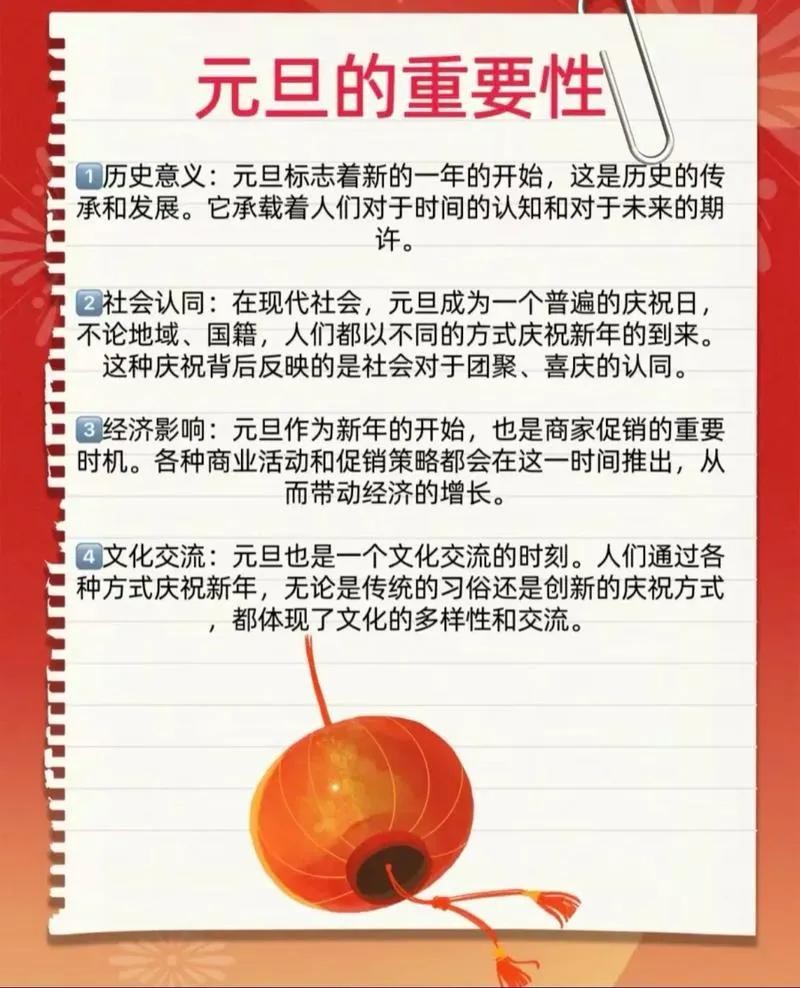 对于整个社会而言,元旦也象征着团结与进步。在这一天,人们不分地域、不分种族,共同庆祝新的开始。各国领导人会发表新年贺词,回顾过去一年的成就,展望未来的发展方向,鼓励民众团结一心,为国家的繁荣富强、世界的和平稳定而努力奋斗。 我们站在元旦这个新起点上,怀揣着希望与梦想,踏上新的征程。让我们在新的一年里,用努力与汗水书写属于自己的精彩篇章,共同创造更加美好的明天。 愿新的一年,阳光满路,温暖如初,所有的美好都如期而至。