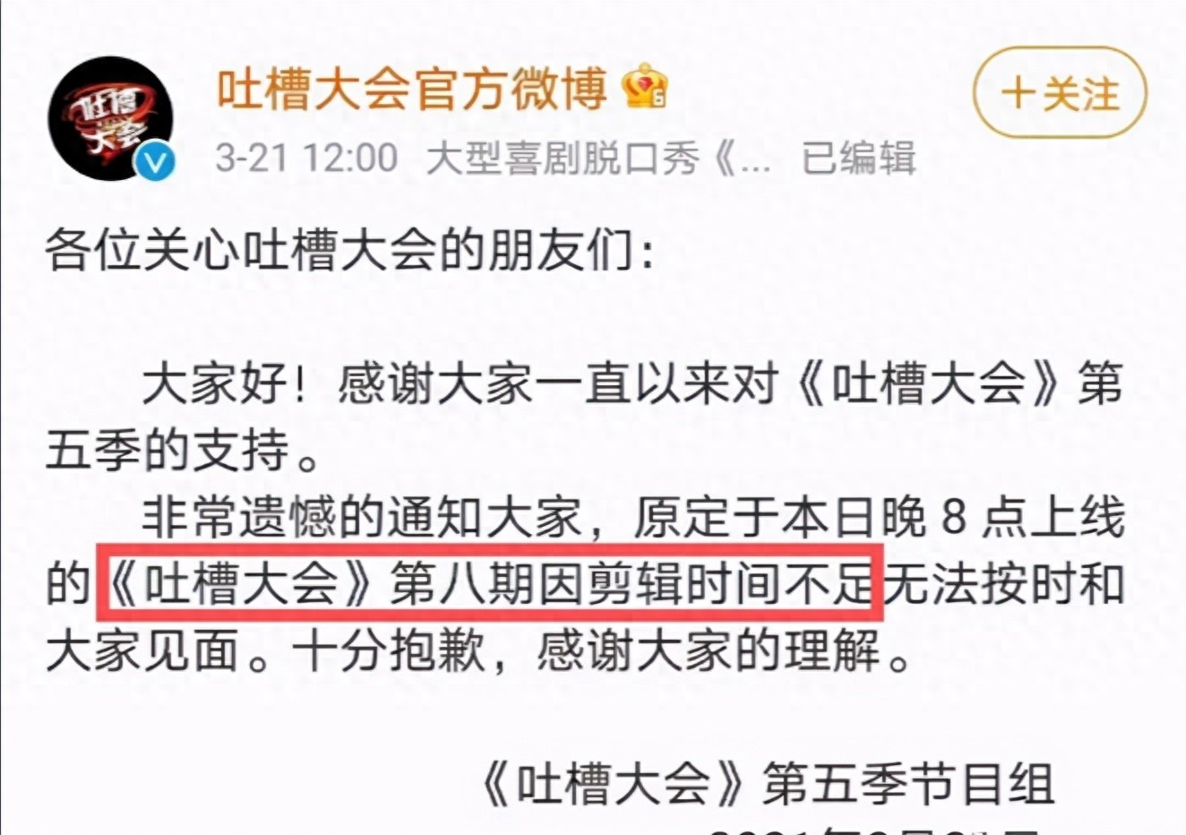 《吐槽大会》官方通知:感谢大家对第五季《吐槽大会》的支持,非常遗憾的通知大家,原定今晚8点上线的《吐槽大会》因剪辑时间不足无法和大家见面。