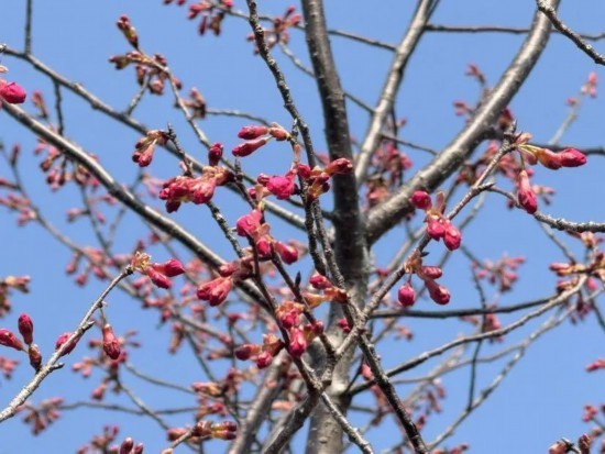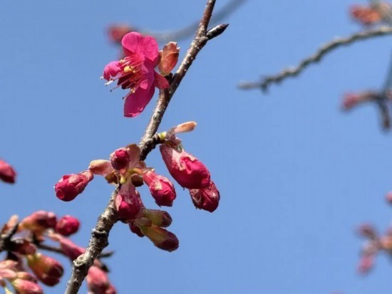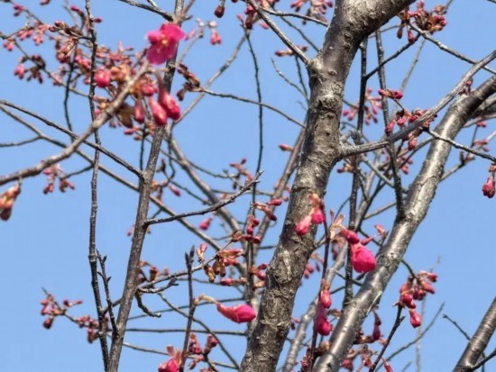 与此同时,园内的钟花樱也已含苞待放,其长长的花柄上,三五朵小花宛如小巧的吊钟或铃铛。据介绍,公园的一些早樱,如梅雪樱、钟花樱这两天都已进入初花期。还有椿寒樱、大渔樱等早樱品种,花苞已经微微泛红、萌动,处于含苞待放的状态。预计在2月底、3月初,大渔樱、椿寒樱等大批量早樱都会进入初花期,3月上旬进入观赏期。