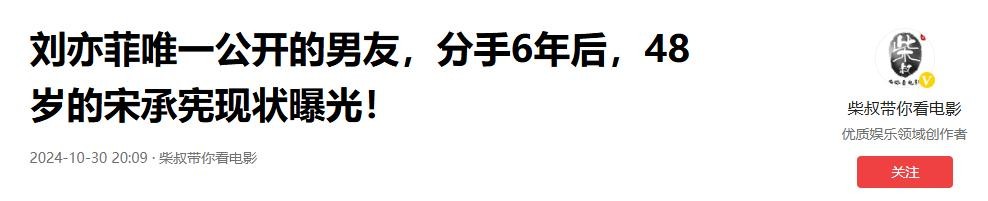 信源:《刘亦菲唯一公开的男友,分手6年后,48岁的宋承宪现状曝光!》2024-10-30 20:09·柴叔带你看电影
