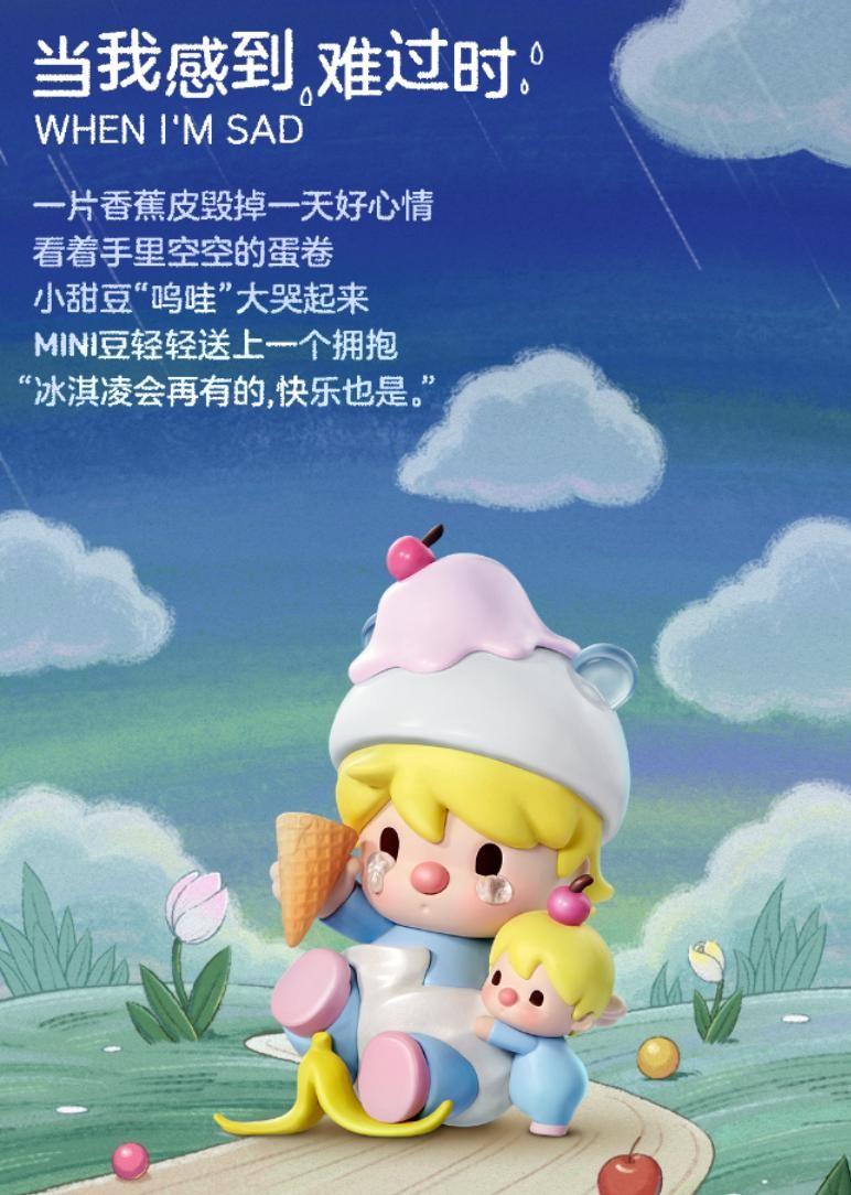 这也是泡泡玛特与迪士尼差异最大的地方,泡泡玛特的系列盲盒的背后没有一个长篇的故事背景,而是一个简单的治愈场景。