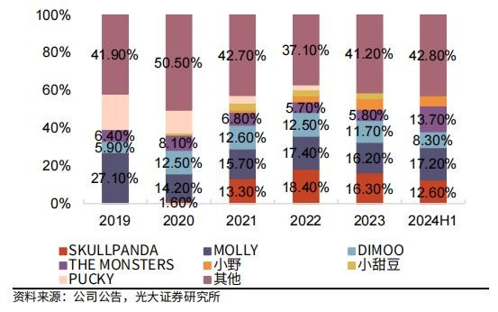 公司呈现IP多元化趋势,截至2024年中报,形成了MOLLY、THE MONSTERS、SKULLPANDA、EDIMOO的四大核心IP。