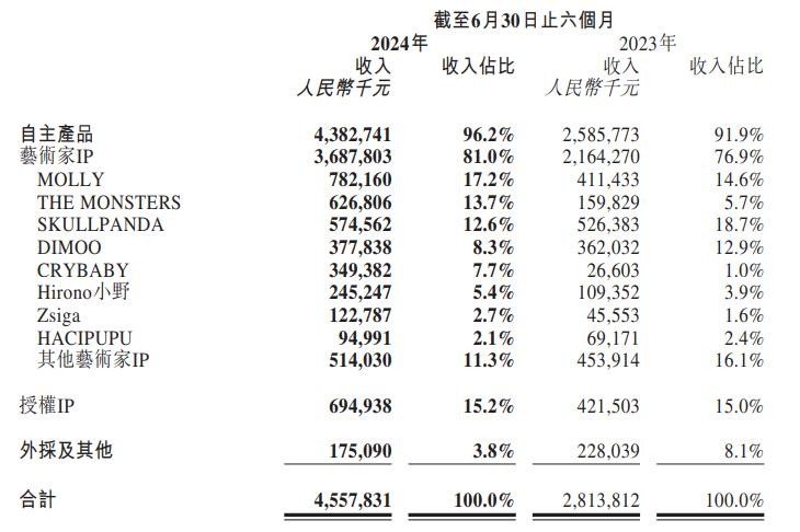 泡泡玛特2024上半年IP收入构成