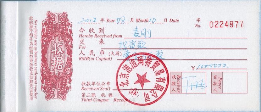 在第一次见面后的五天,2012年8月10日,支付了第一笔投资款100万,并留下了一张手写支票(合计两百万)。