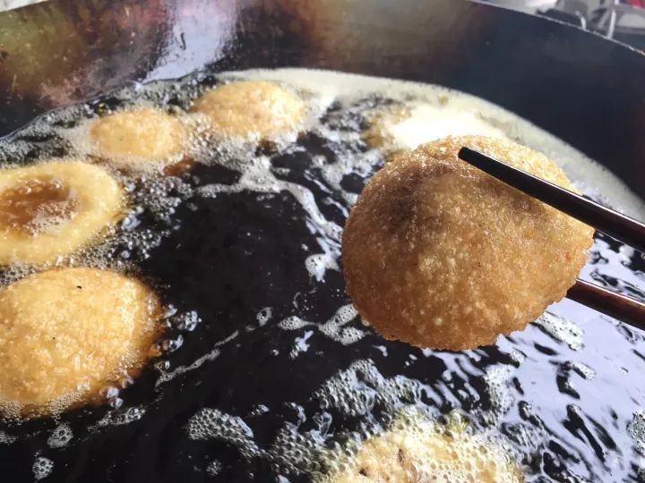 今天,我给大家介绍的是四川的“打锅盔”。打锅盔随便在四川哪个城市,县城,乡镇,都是可以看到的。为什么会叫打锅盔呢?因为把揉好的面团,用面棍打,打成粗粗的长条形状,里面放上肉馅,以及香菜。再合上,用有力的拳头拍打成圆状,放入油锅中炸。不断用食指转着面块,方便均匀受热,然后,再翻转一面。同样的方法受热,看着不流口水都难。锅盔在刚起锅的时候是最好吃的,当然,没有掌握方法的人在这个时候吃,舌头和嘴巴也是会受一定苦的。香脆的外壳,鲜嫩的馅,吃着都觉得舒服。