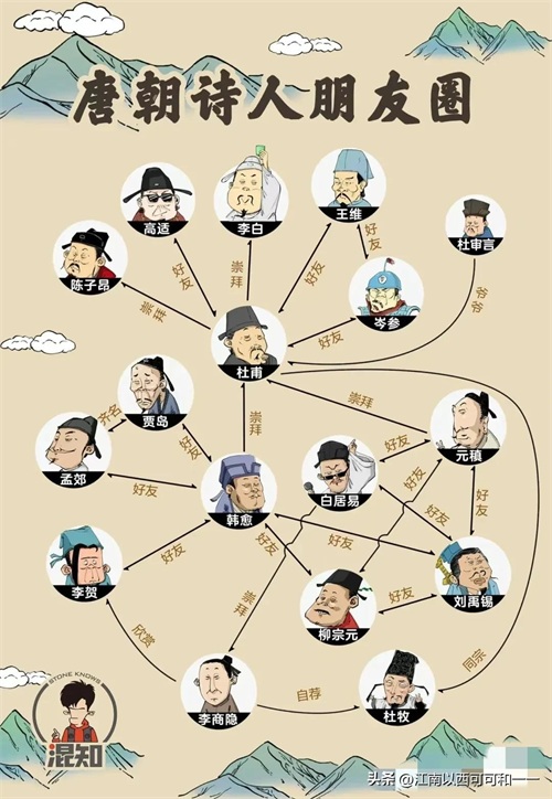 66、王建(约767-830?),字仲初,颍川(今河南许昌)人。出身寒微。大历十年进士。曾作过县尉、县丞、司马一类的小官,又从军到边塞,晚年退居今陕西西安市。擅长乐府诗,与张籍齐名。其以田家、蚕妇、织女、水夫等为题材的诗篇,对当时政治的腐朽和人民生活的痛苦作了不同程序的反映,语言也较朴实。 67、韩愈(768—824),唐代文学家、哲学家。字退之,河南河阳(今河南孟州南)人。自称郡望昌黎,世称韩昌黎。官至吏部尚书。卒谥文,世称韩文公。与柳宗元同为唐代古文运动的倡导者,列唐宋八大家之首。诗风奇崛雄伟,对宋代诗歌影响很大。有《昌黎先生集》。