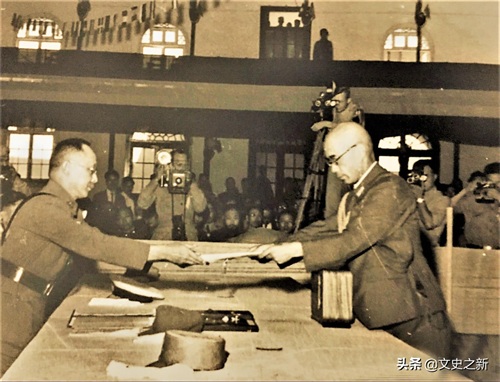 冈村宁次递交投降书给何应钦