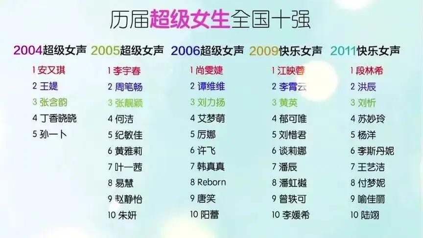 2004年第一届冠军安又琪,季军张含韵,她俩人我认为还是很成功的,前者没大红,后者没有发资,配得上她们的选秀成绩