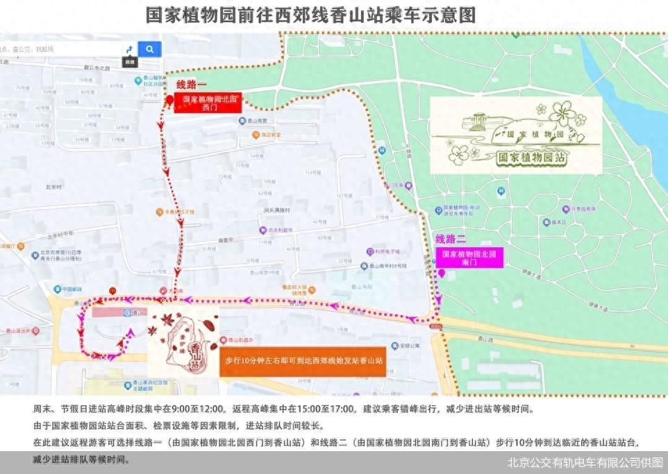 根据往年客流数据,西郊线“赏花季”期间,周末、节假日进站高峰时段集中在9:00至12:00,返程高峰集中在15:00至17:00,建议乘客错峰出行,减少进出站等候时间。由于国家植物园站站台面积、检票设施等因素限制,进站排队时间较长,建议返程游客可选择从国家植物园西门前往临近的香山站乘车,减少进站排队等候时间。