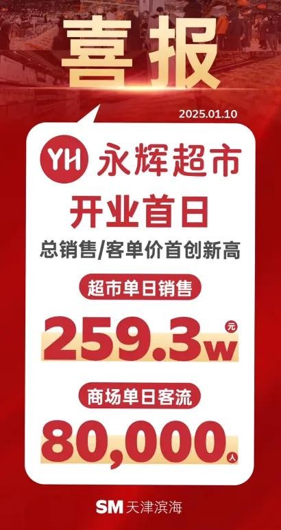 1月10日,调改后的永辉超市SM天津滨海城市广场店恢复营业,人气异常火爆,与此同时,首日数据也随之曝光。(津闻丨环空港(编辑)、图源自SM天津滨海城市广场、Mall More、天津全接触、网友实拍)