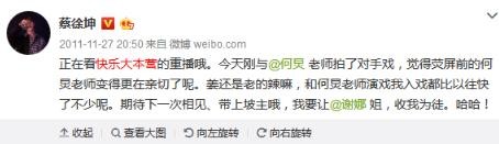 近日,蔡徐坤携nine percent队员亮相《快乐大本营》录制,这也是自《偶像练习生》结束后,该团队全员集结的综艺首秀。而蔡徐坤的一张旧照却在节目中意外曝光。照片显示,2011年,蔡徐坤与何炅合作拍摄电视剧,收工后兴奋合影,并配文道:“期待下一次相见,带上坡主哦,我要让谢娜姐收我为徒”。
