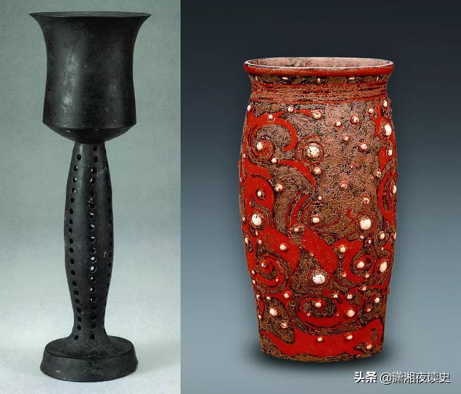 5000年前的大汶口黑陶,最薄的地方仅0.2毫米。右边是良渚嵌玉漆杯,技术水平都领先埃及一个时代