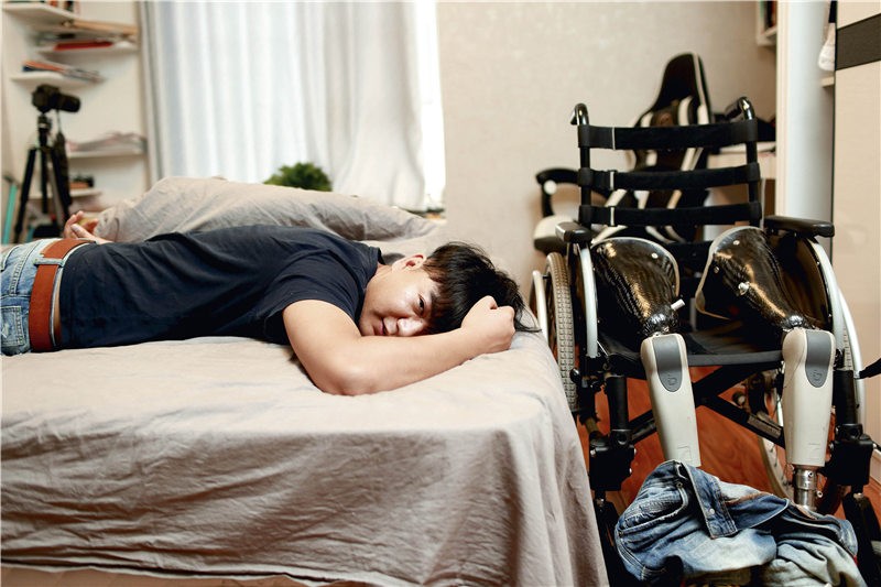 在陈问奇陷入厌学情绪时,郑海洋还在外地进行截肢术后的康复训练,需要穿戴假肢,练习步态以及摔倒后如何站起来。整个过程十分艰难、疼痛,“一天流汗都要湿好几件衣服”,整个人瘦了几圈。