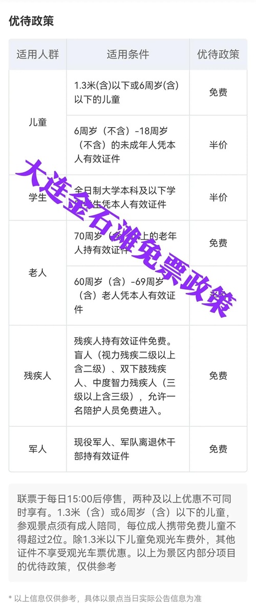 大连金石滩景区免票政策,这6类人员免门票,免费啦。具体包括:儿童,70岁以上老人,残疾人,军人等。