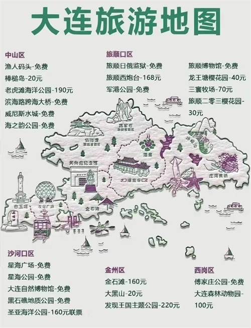 - 主要景点:大连滨海国家地质公园、黄金海岸、金石文化博览广场等。其中,金石滩黄金海岸是中国北方最大的天然沙滩海水浴场。