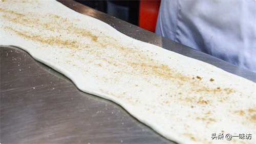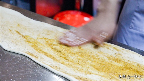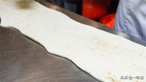 和面过程中,就这样压挤揉就可以,把面揉成一个光滑的面团,像这样就可以,把揉好的面团用擀面杖,擀成这样的长片,将面片上撒上十三香,将十三香均匀的涂抹在面片上,抹均匀确保咱们每一口都能吃到。