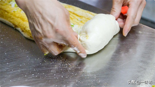 卷面卷的时候,咱们就像这样,边卷边把两面的面往回收,这一步主要是成型,葱碎也能均匀的在面片上,卷成这样的面卷就可以啦。