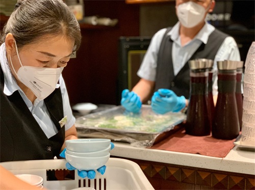 服务领班赵爱华:就是把小碗等餐具,在餐前都要检查一遍,葱花、香菜、餐巾纸、菜单、火锅里加的水咱都提前要准备出来。