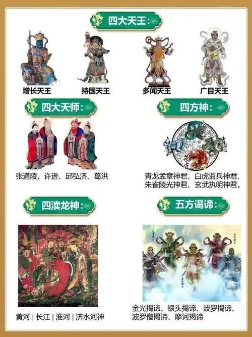 四大天王,增长天王魔礼青、广目天王魔礼红、多闻天王魔礼海、持国天王魔礼寿,他们守护着佛教的四大部洲,是佛教护法神,其形象在各种文学艺术作品中频繁出现。增长天王手持宝剑,象征着智慧和力量,能够斩断烦恼和邪恶;广目天王手中缠绕着一条龙,寓意着他能够观察世间万物,洞察一切;多闻天王手持宝伞,代表着他能够保护众生,免受风雨的侵袭;持国天王手持琵琶,象征着他能够以音乐的力量感化众生,维护世界的和平与安宁。