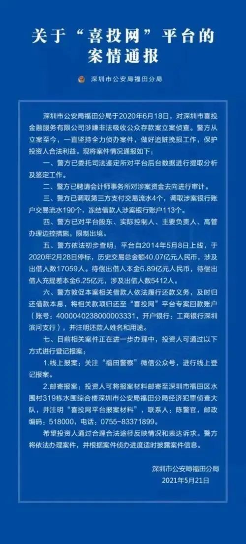 2020年6月,深圳警方对喜投网进行立案调查,同时,警方已对平台股东、实际控制人、主要负责人、高管办理边控措施,限制出境。
