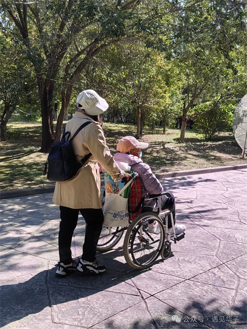 老妈连拐杖都不愿拄,说服她坐轮椅,心里还真没底。还好老妈同意了,不过,开始一直走着。后来累了也就坐了上来。