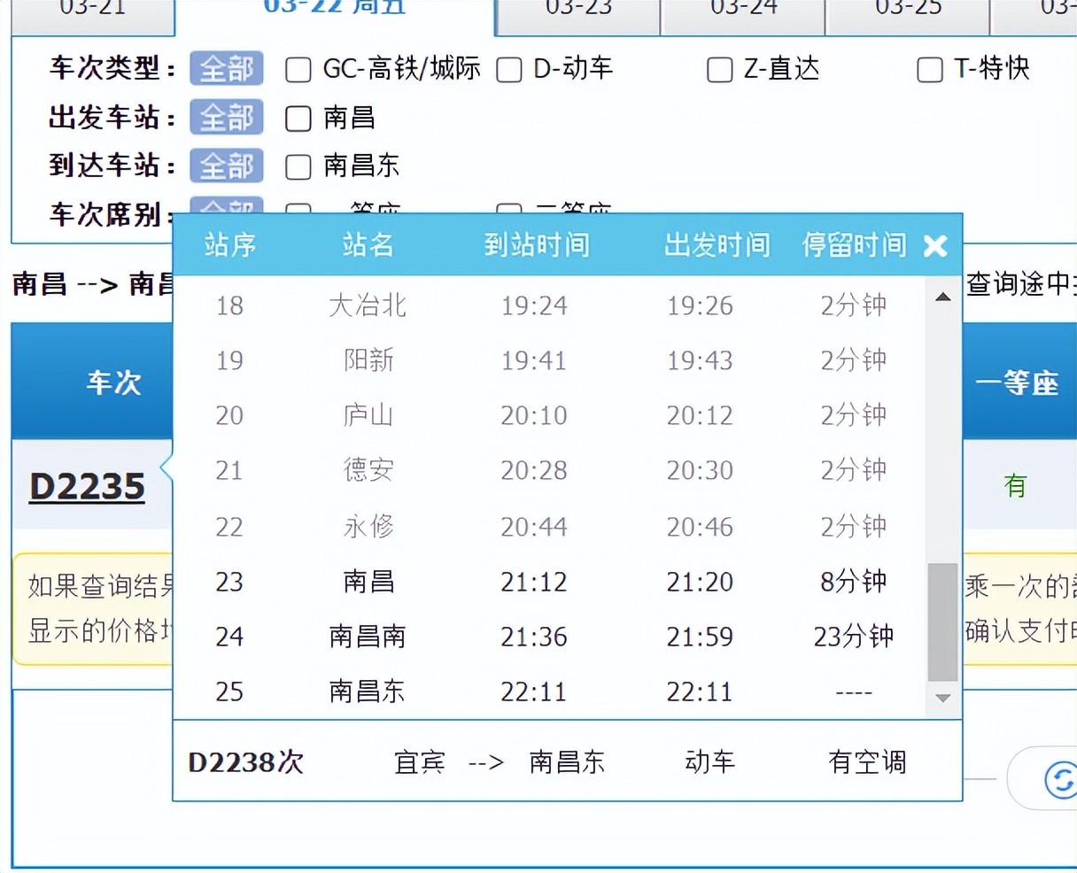 大家可能很疑惑,南昌站到南昌东站短短的37公里坐动车竟然要将近一个小时才能到达,为什么要这么久呢?从南昌站到南昌东绕不开南昌南站,南昌南站一头连着京九铁路与南昌站相通,一头通过联络线与南昌东站连接,因此南昌南站就成了连接南昌站和南昌东站的必经之地。南昌南站位于南昌站和南昌东站"V"字型的夹角位置,列车无法在京九铁路和昌景黄高铁之间直接换向运行,这就导致运行于南昌站和南昌东站之间的所有车次必须在南昌南站进行换向,需要停靠较长时间,这些车次在南昌南站最短需要停靠16分钟,最长则需要停靠23分钟,再加上列车的运行时间,使得南昌站和南昌东站之间短短的37公里竟然耗时将近一个小时。