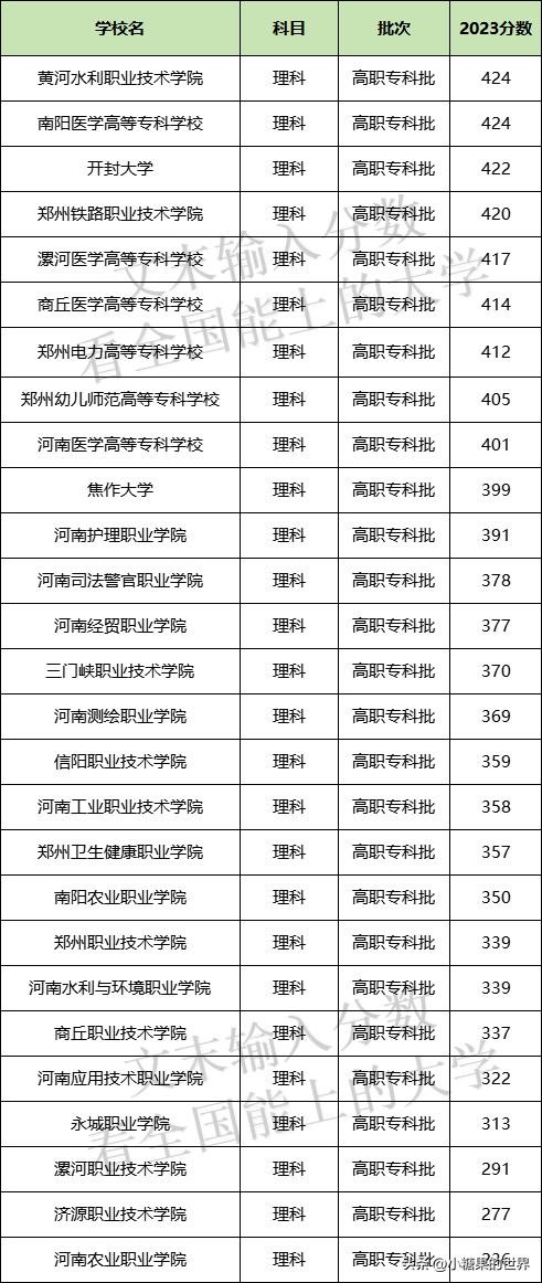 河南所有公办大专理科分数线表