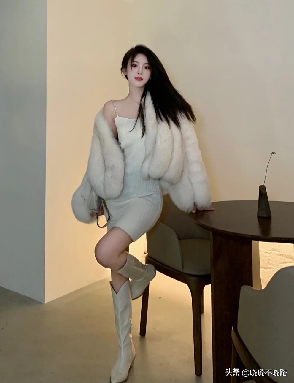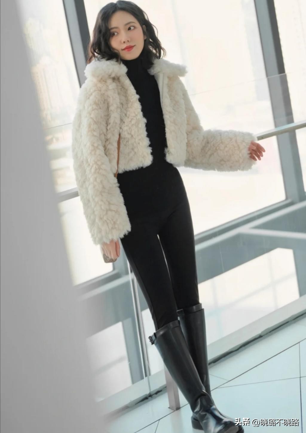 ➌ 收腰式皮草外套+基础款长筒靴,简约大气显高级