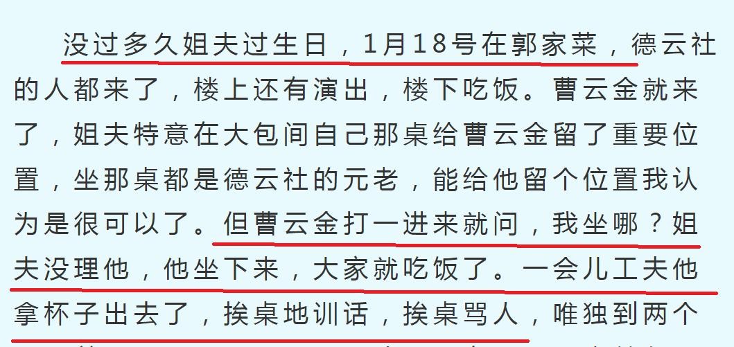 2010年1月18日郭德纲生日宴,C某,也就是曹云金,一进来就开始摆谱,然后端着杯子挨桌训话和骂人。
