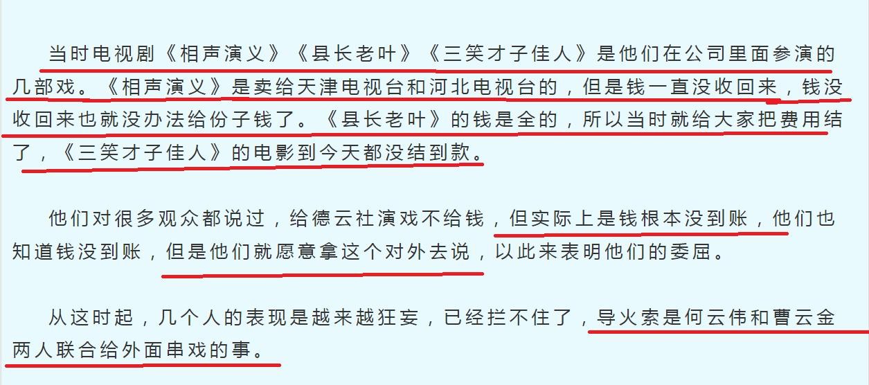 他们对很多观众说给德云社演戏不给钱,实际上是钱根本没到账,他们知道没到账还到处说,以此表明他们的委屈。