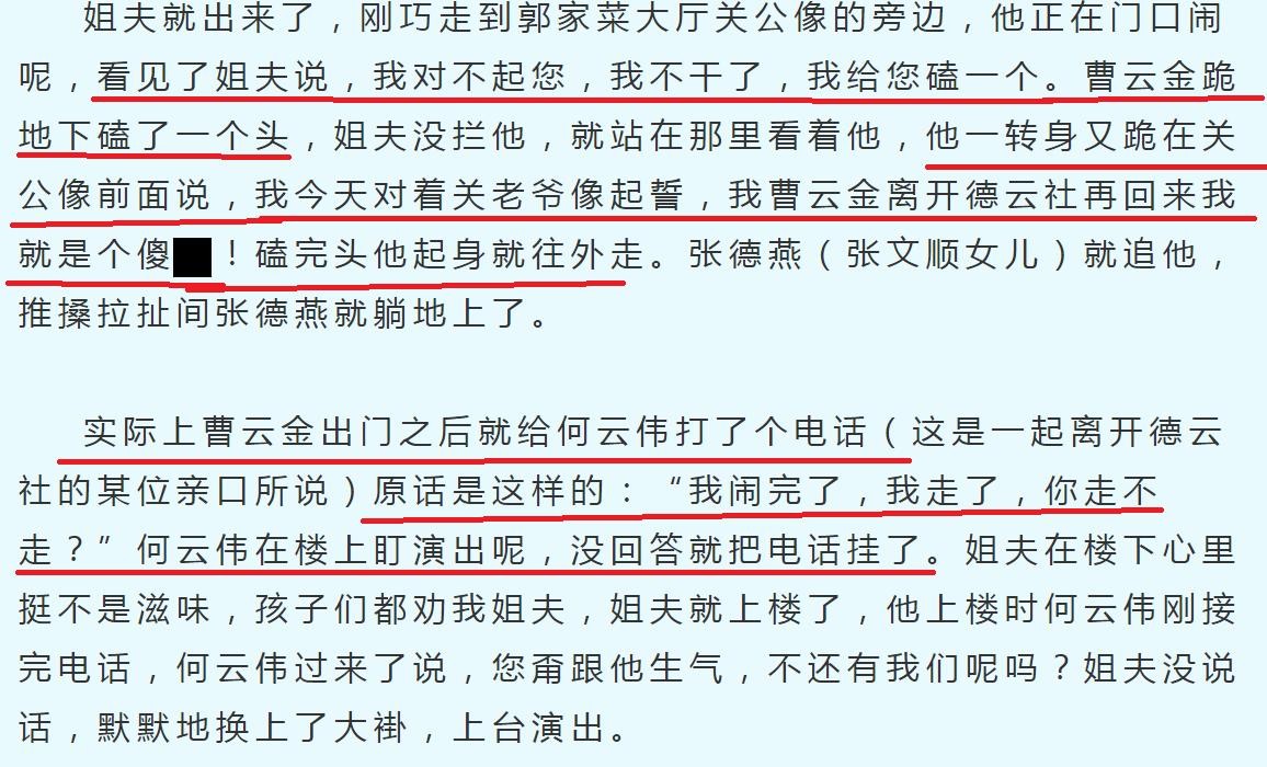 曹云金出来之后立刻给H某也就是何云伟打电话:我闹完了,我走了,你走不走?何云伟正在舞台盯场,把电话挂了。