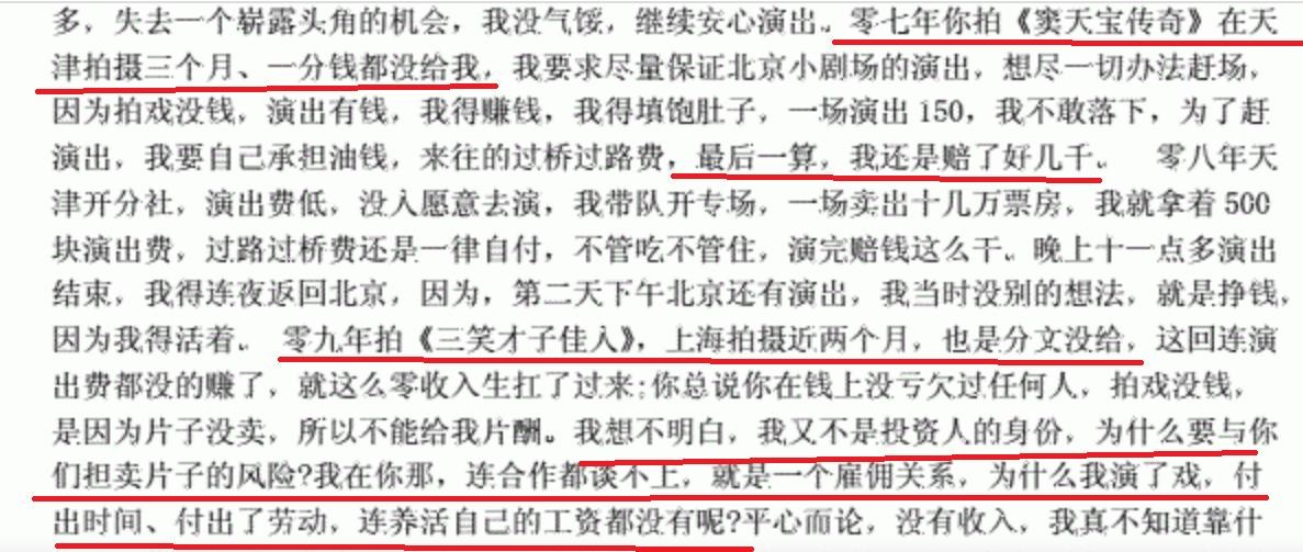 这件事在曹云金的长文中也能得到证实,他说自己2007年拍《窦天宝传奇》三个月,一分钱没给。2009年拍《三笑才子佳人》两个月,也是分文没给。