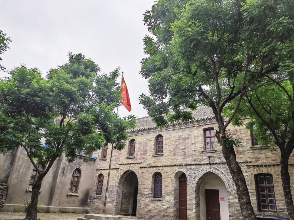进入教堂,院落曲折幽深,前院里,六棵高大的国槐树绿意葱茏,院子里立着一个旗杆,杆顶的五星红旗迎风飘扬。