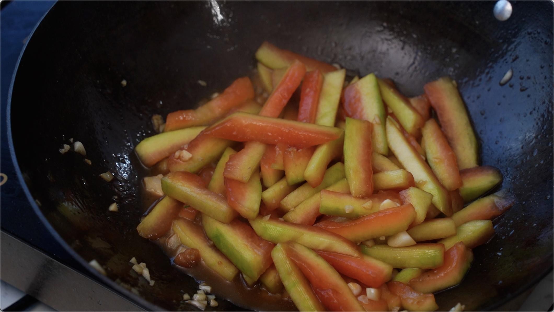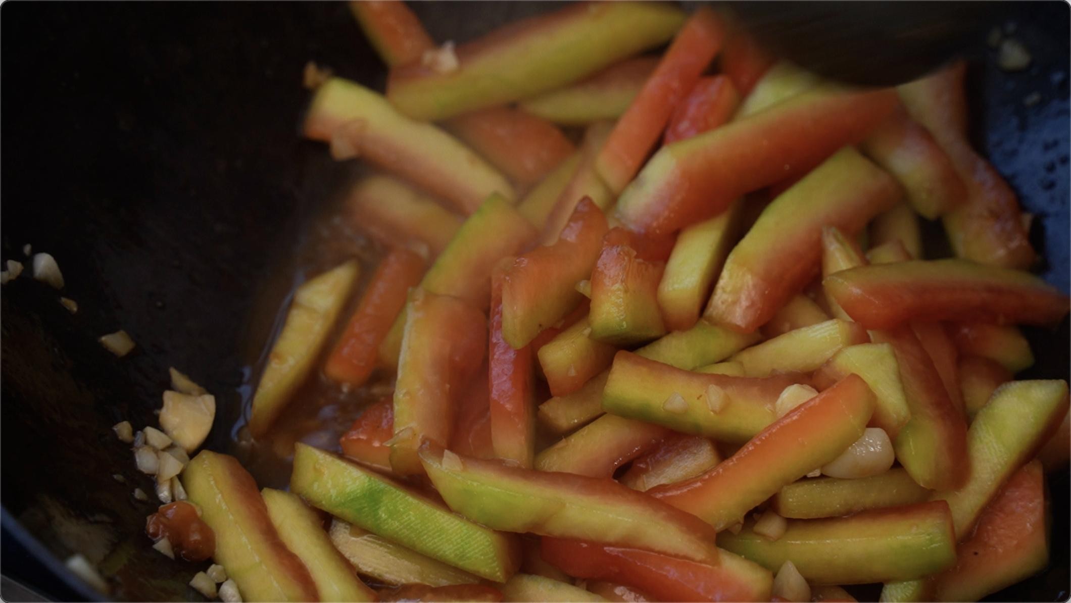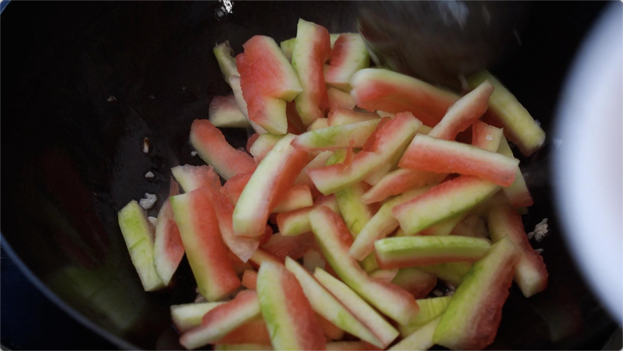 等我们的蒜炒香以后我们下去西瓜皮条,翻炒均匀。