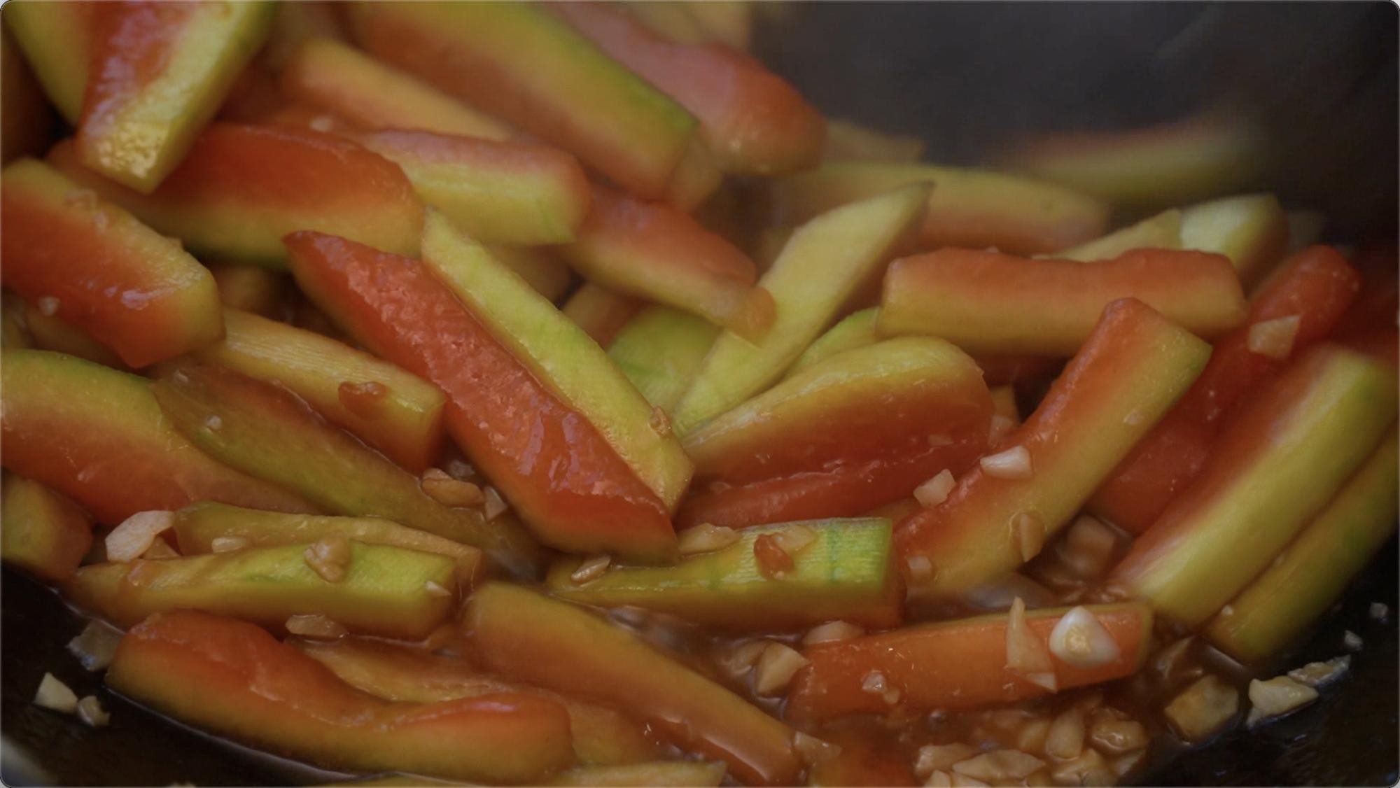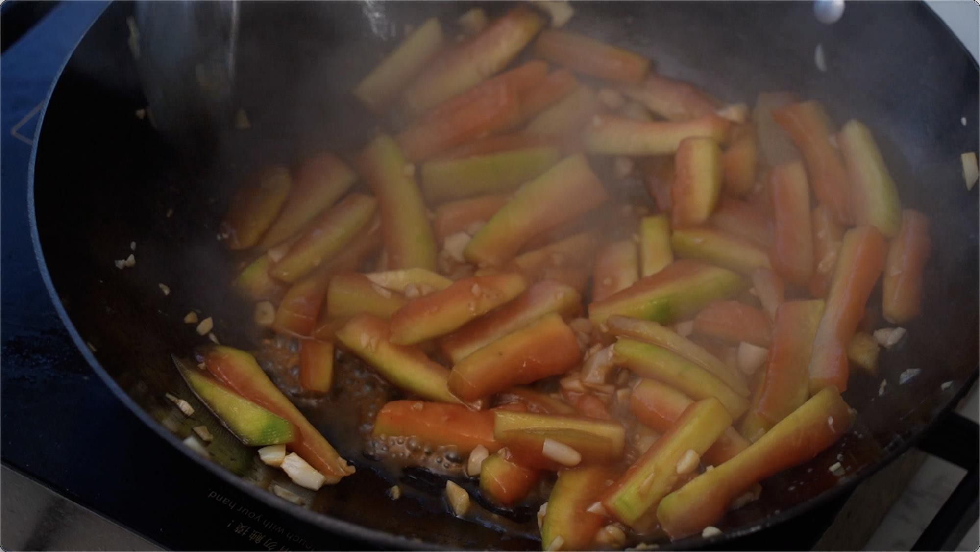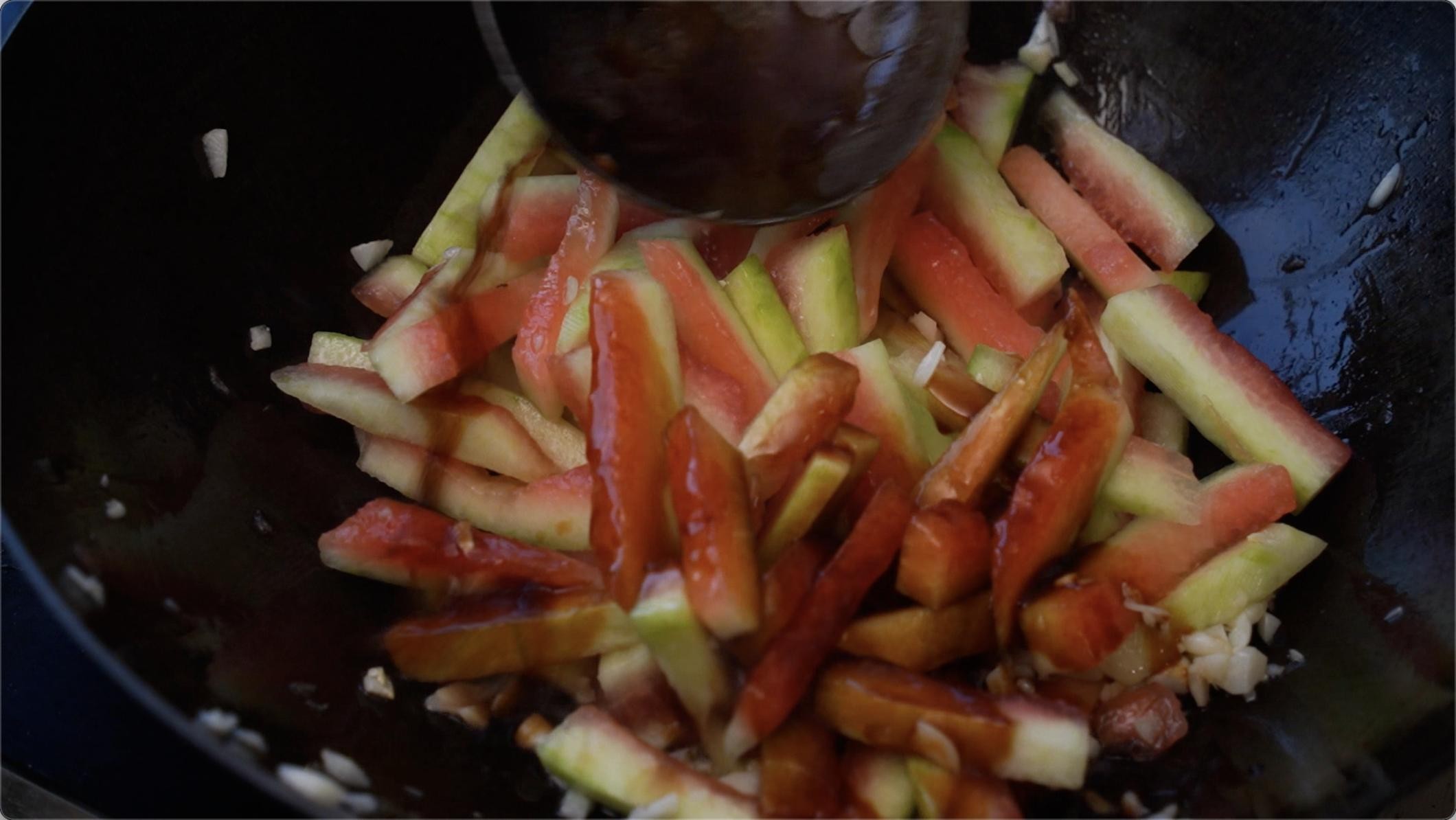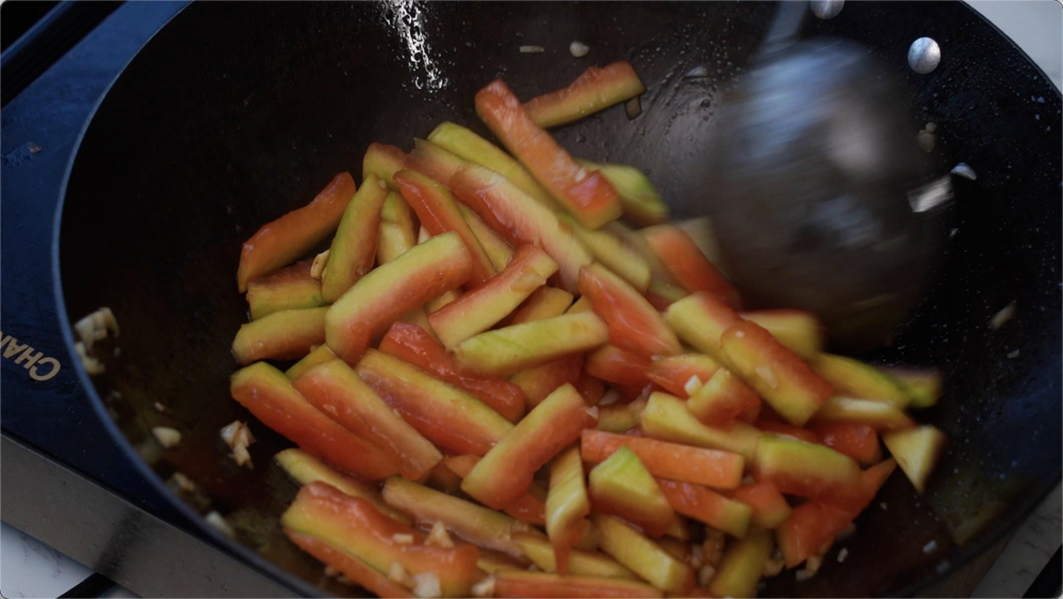 等我们的蒜炒香以后我们下去西瓜皮条,翻炒均匀。