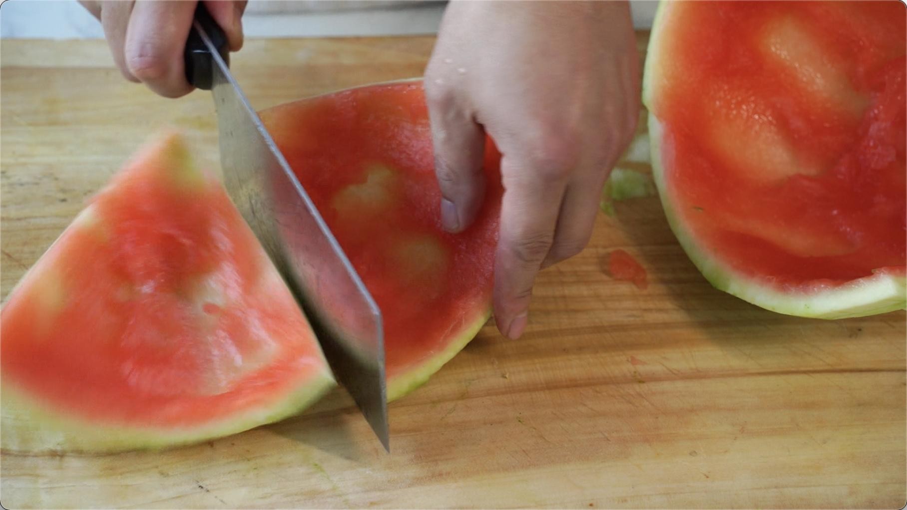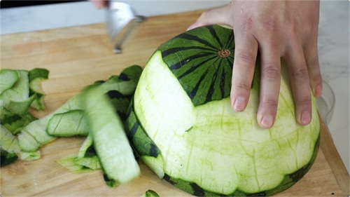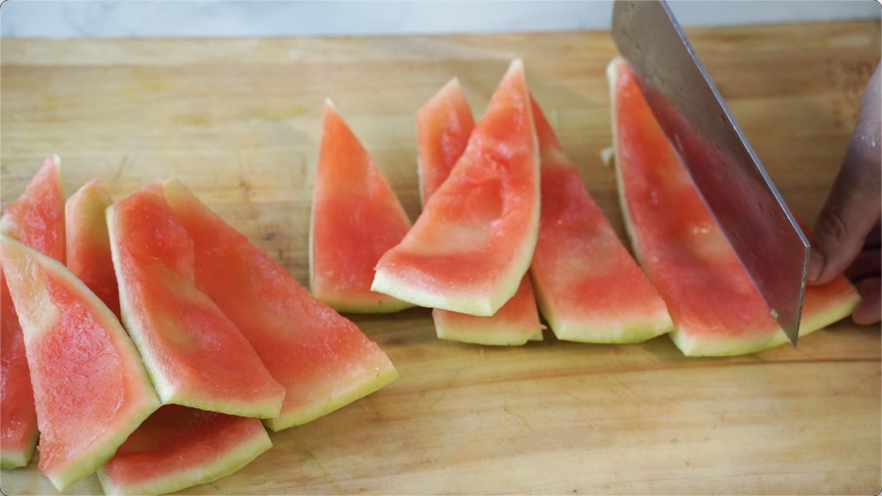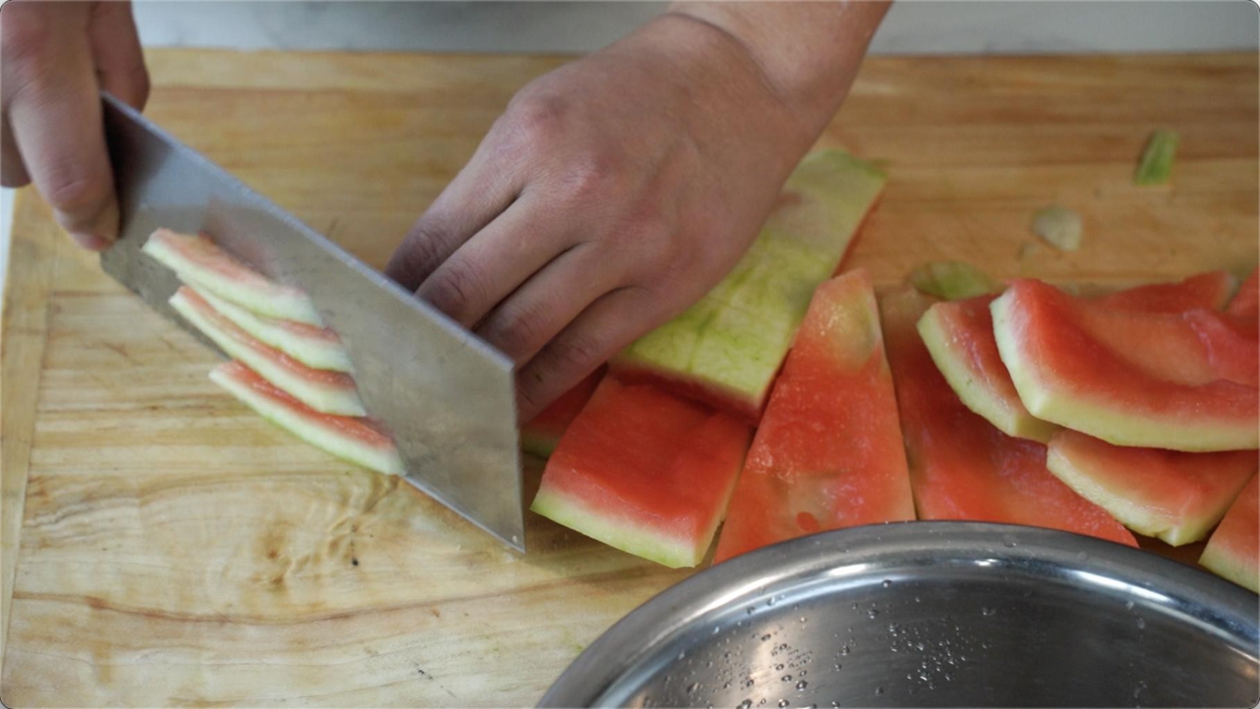 瓜皮要带少许瓜肉,去外皮。瓜肉甜,连带瓜皮的地方是脆爽,搭配一起,口感丰富。还有就是如果不是马上吃,建议用保鲜盒装好放入冰箱,天气热,切开的西瓜容易变质。西瓜皮要挑选肉厚,脆爽的西瓜皮。