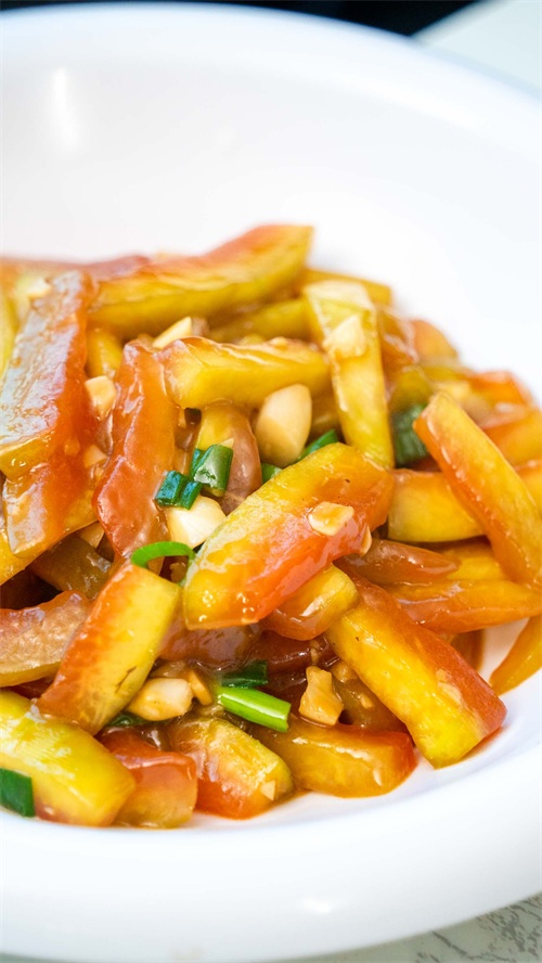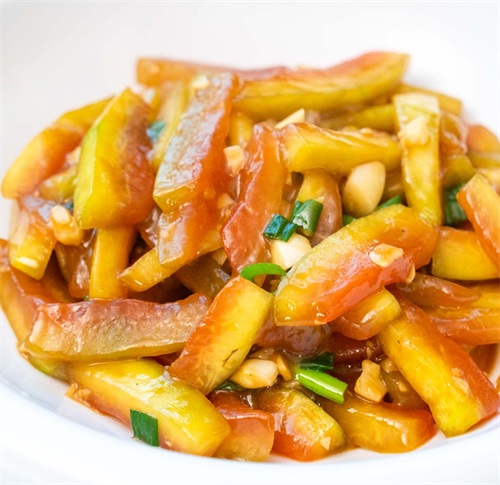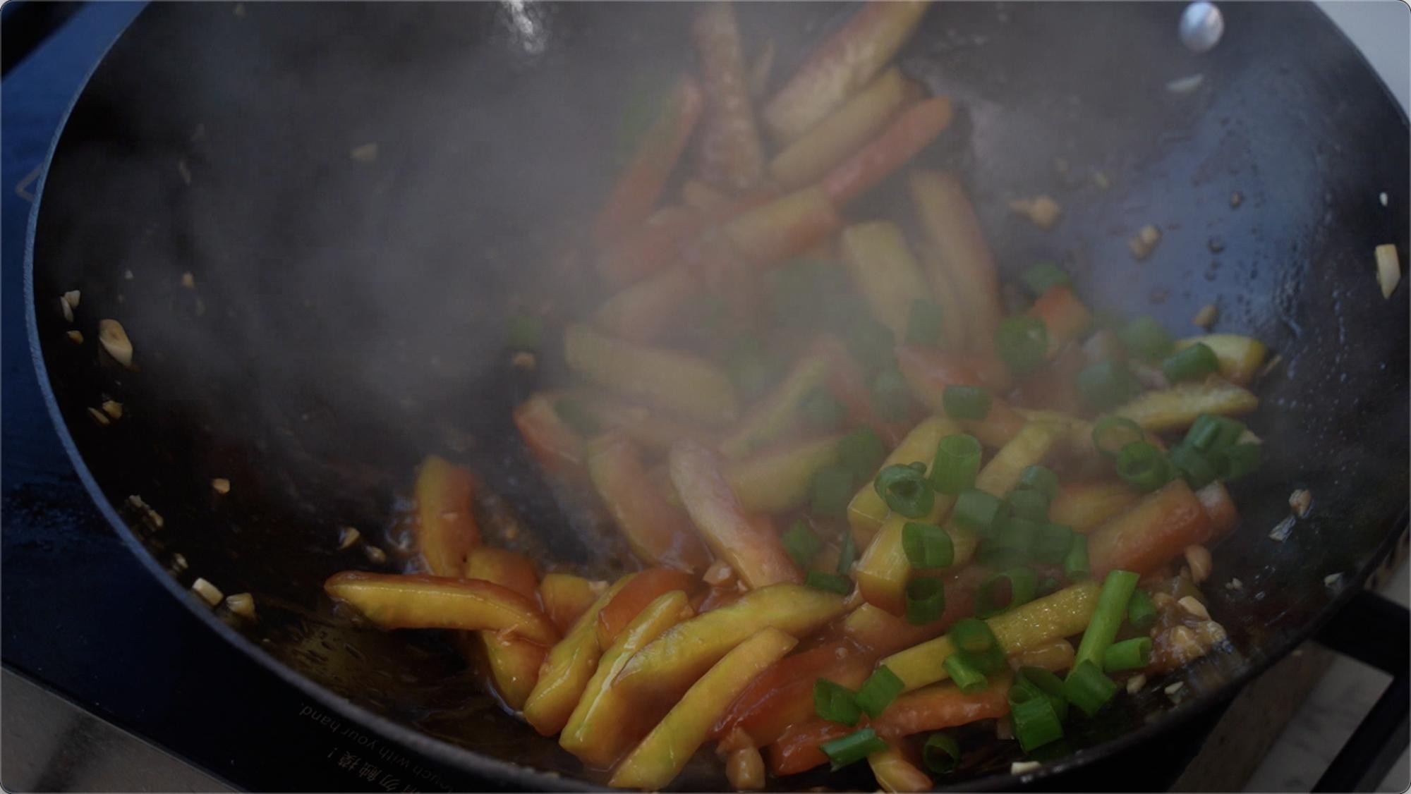 等西瓜条煮入味后再加入少许生粉水一起勾芡就可以,最后加入葱花快速翻炒就可以出锅了。