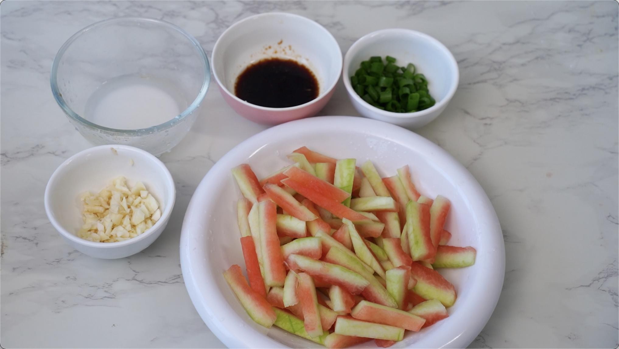 西瓜皮300克 蒜15克 小葱花适量