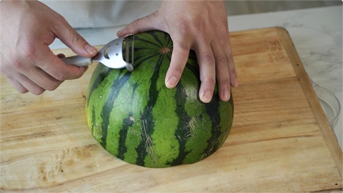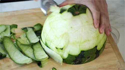 把我们的西瓜皮用削皮刀去皮,基本要要去表面的皮干净就可以。