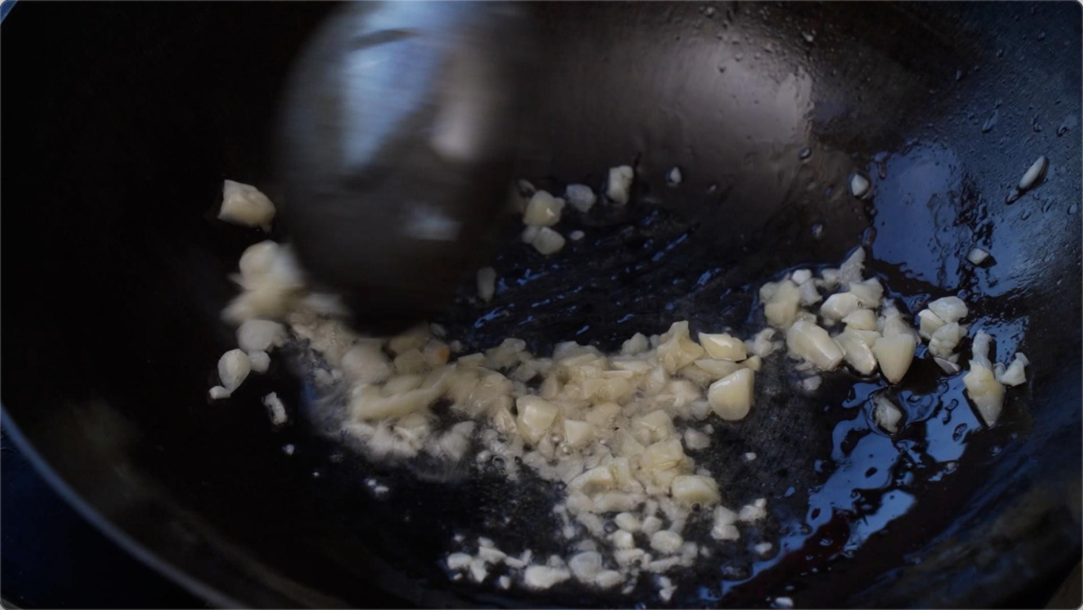 我们锅中下去油,把切好的蒜炒香!