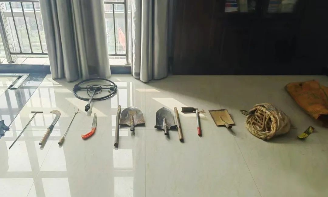 专案组逐步梳理出该盗墓团伙的人员身份及分工,经过多日实地走访及视频调查,迅速开展收网行动,于2023年9月6日凌晨,在怀化市鹤城区某酒店内将正在休息的7名犯罪嫌疑人抓获,现场查获地质勘探仪器、探钎、铁锹等大量作案工具。