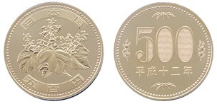 最后就是上图的五百日元硬币了,这是目前日本面额最大的硬币。500日元硬币到目前为止总计只发行过两个版本。两个版本图案相同,不过颜色不同,旧版为银色,新版为金色,两者边缘都有凹槽。上图为目前的新版五百日元硬币。目前的五百元硬币发行于2000年,其实初代的五百元硬币也是于1982年才发行的,在那之前五百日元一直是纸币。