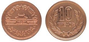 上图左侧的图案为平等院凤凰堂(平等院是一所位于日本国京都府宇治市的佛寺),右侧图案为常绿树(常盤木)。十日元硬币的材质为青铜、锌和锡。此硬币有两种版本,早期版本为1951年发行,边缘有凹槽,发行后没有多久就停发了。后期(现行)版本的边缘平滑,首次发行与1959年。