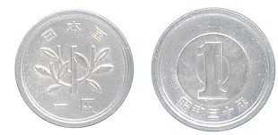 上图左侧图案为树苗。边缘平滑,材质为铝。首次铸造年份为1955年。在日本购物时,常常一不小心就会“收获”一大堆的一元硬币。购买力几乎等于无,在日本拿着1日元硬币是什么也买不到的。