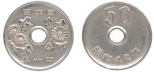 现行的五十日元硬币最早发行于1967年,左侧图案为菊花,材质为白铜和镍,边缘有凹槽,同五日元一样,中间有孔。