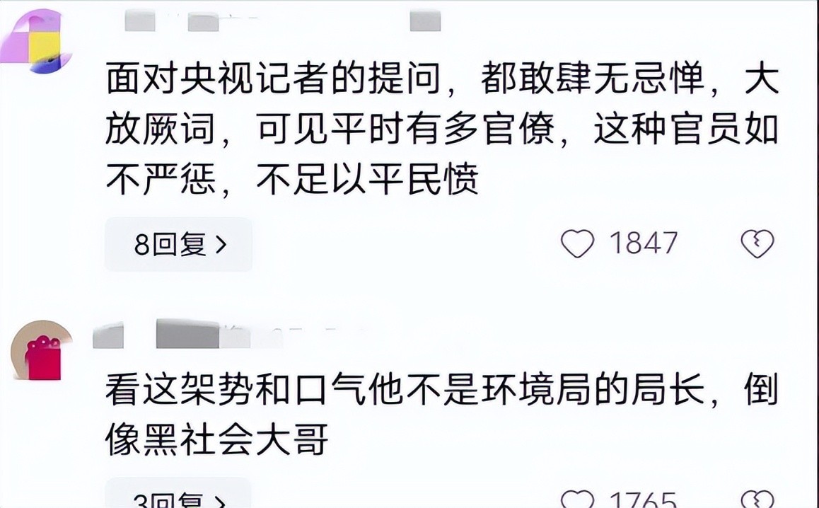 “看这架势和口气他不是环境局的局长,倒像黑社会大哥?”另一位网友评论道。