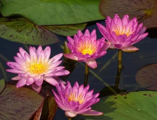 目前都已进入盛花期,园区有超过90%的睡莲已盛开。在耐寒睡莲展区,首次展出荣登“世界睡莲名人堂”,以及荣获“中国睡莲终身成就奖”的黄国振先生育成的 “红宝”、“贵妃”等睡莲,是我国首批拥有自主知识产权的睡莲品种。
